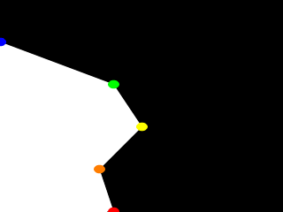 The end result is: when we render this code, we see a white lathe against a black background showing us how the curve we've declared looks, and the circular ends of the cylinders show us where along the x-y-plane our control points are. In this case, it's very simple. The linear spline has been used so our curve is just straight lines zig-zagging between the points. We change the declarations of Red_Point and Blue_Point to read as follows (see file lathdem3.pov).