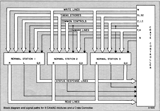 CAMAC modules may be plugged into a CAMAC crate which has 25 STATIONS, numbered 1 - 25. Station 25, the rightmost station, is reserved for a CRATE CONTROLLER, whereas Stations 1 - 24 are NORMAL STATIONS used for CAMAC modules (see Block Diagram). Usually, Station 24 is also used by the controller in that most controllers are double width (#2 CAMAC). The purpose of the controller is to issue CAMAC COMMANDS to the modules and transfer information between a computer (or other digital device) and the CAMAC modules.