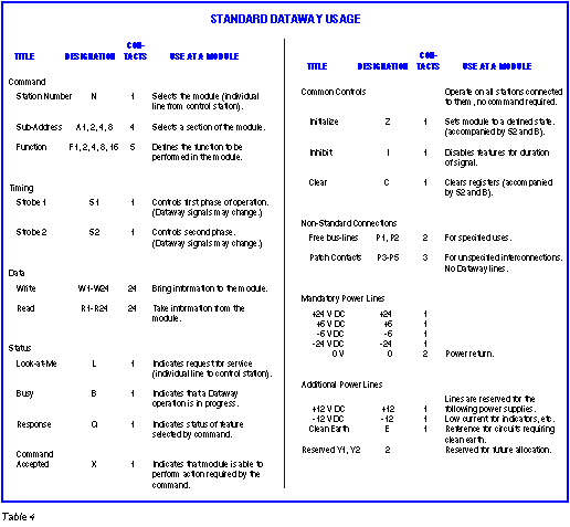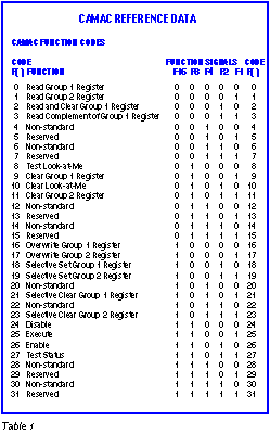 In a typical DATAWAY operation, the crate controller issues a CAMAC COMMAND which includes a station number (N), a subaddress (A), and function code (F), (see Table 1). In response, the module will generate valid command accepted (X response) and act on the command. If this command requires data transfer, the (R) or write (W) line will be used. Note that the terms Read and Write apply to the controller, not the module. For example, under a Read command, the controller reads data contained within a module.