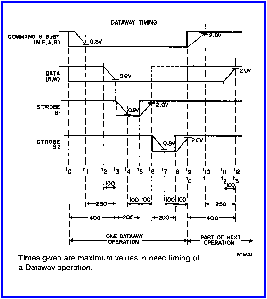 The sequence of events during a single DATAWAY operation is shown in the Timing Diagram . The shaded areas indicate the permitted variation of each signal between an ideal square signal and a signal whose transition across the appropriate signal threshold (0.8 V or 2.0 V) satisfies the conditions shown. The signal waveforms for the command and data lines apply to those lines, if any, which take up the "1" state. Other command and data lines may, of course, be in the "0" state during the operation.
